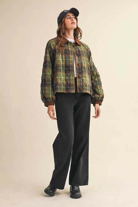 Plaid Quilted Jacket with Contrast Corduroy Detail